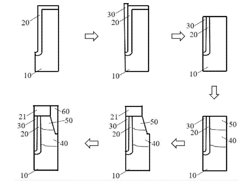 1、提供一P型外延衬底,并在P型外延衬底上刻蚀形成沟槽,在P型外延衬底的表面和沟槽上沉积预设厚度的第一介质层20。沟槽的深度为1μm-1.5μm。预设厚度为400Å-700Å。当预设厚度太薄时,无法有效地隔离衬底与栅极,造成短路。第一介质层20的生长温度为800℃-1100℃,通过热氧和高温的方式,能提高第一介质层20的致密性和平整性。